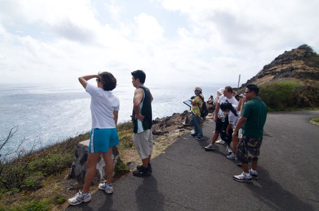 We gathered at the trailhead at 9:30 am, threw on the sunscreen, hydrated, and (leisurely) began our trek. There were many stops along the way to take some photos, talk story, take a breather, and look for any whale movement. Many of us shouted out like children at Disneyland whenever we spotted something, anything, that could have been those mystifying creatures. One of the passersby remarked, “I don’t get it. What are they all looking at? Am I supposed to be seeing something?” as she sighed and walked on by our group. So how many whales did we actually see: 1? 10? 200? Probably less than 10, but no one kept score as we just enjoyed the chance to get some sun, mingle, and enjoy the beauty of Hawaii.